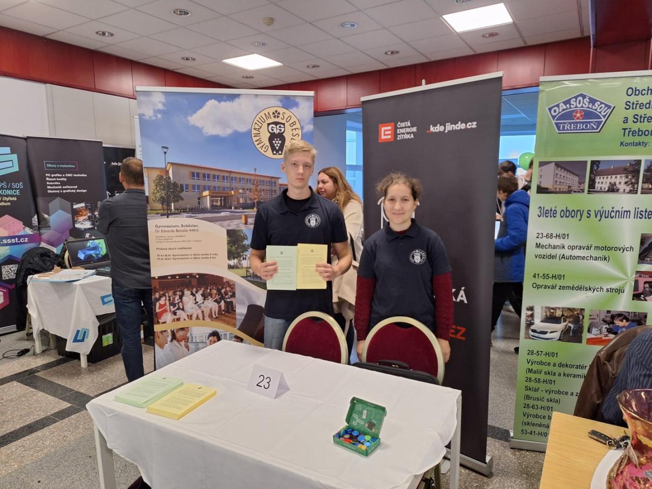 Naši studenti ochotně prezentovali a představovali naši školu rodičům a uchazečům o studium na střední škole. Desítky stánků vystavujících škol z celého Jihočeského kraje tentokrát shlédlo na 1400 návštěvníků. Studentům děkujeme za příkladnou reprezentaci školy.