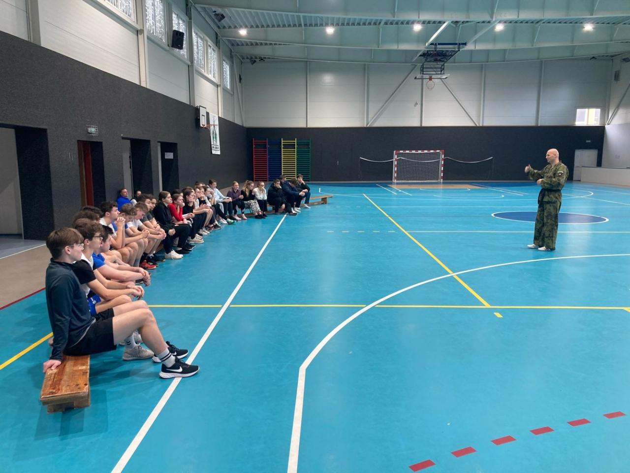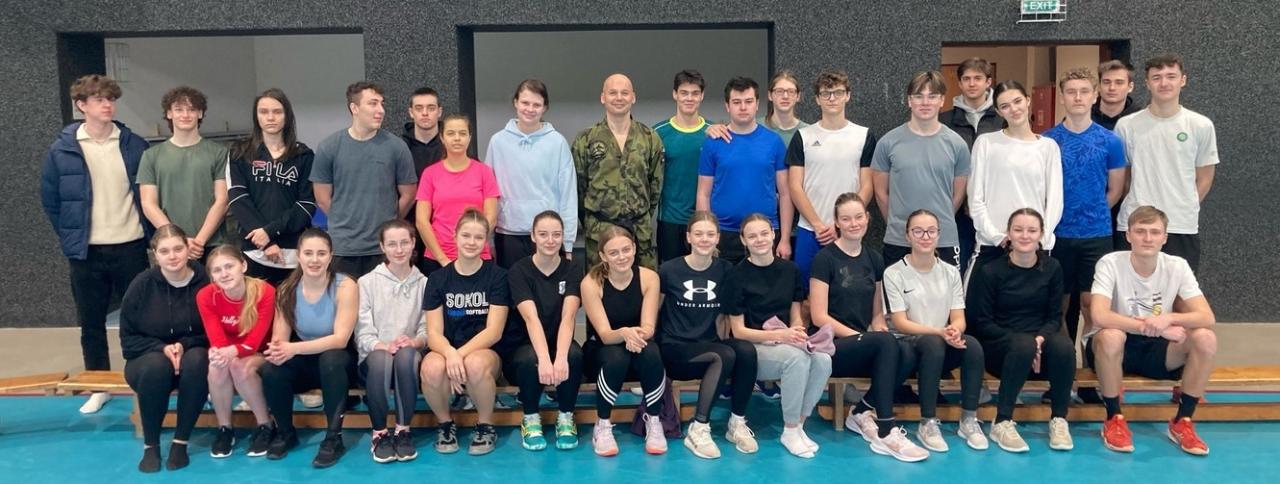 Po úvodní přednášce, ve které shrnul podmínky přijetí a studia na Univerzitě obrany, následovala intenzivní rozcvička a praktická část, při které si studenti vyzkoušeli, jak se bránit při napadení.