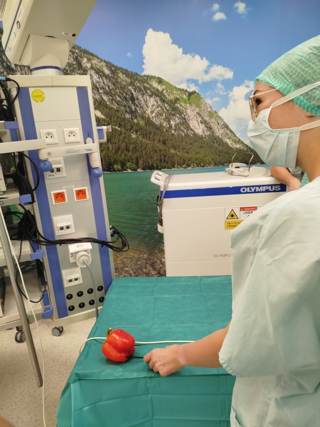 stanoviště. Prvním bylo kardiocentrum, kde nás se svou profesí seznamoval patron celé Akademie, pan doktor Ladislav Pešl. Druhou zastávkou byly centrální laboratoře. Program jsme zakončili v centrálních operačních sálech. Přímo v hybridním sále jsme si mohli vyzkoušet endoskop v praxi při pozorování papriky :).